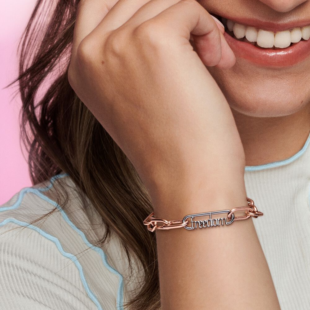 Noś pozytywny przekaz gdziekolwiek jesteś z ozdobnym ogniwem Pandora ME Freedom. Na ręcznie wykańczanym, platerowanym rutenem ogniwie widnieje słowo „freedom” w gotyckim alfabecie, przypominając Ci, że możesz być sobą i świat należy tylko do Ciebie. Dodaj znaczenia swoim stylizacjom, umieszczając to ozdobne ogniwo z łącznikami na bransoletkach, naszyjnikach lub kolczykach. Możesz nawet nadać mu bardziej osobisty charakter, dodając medalion. Wskazówka stylizacyjna: jedno ozdobne ogniwo ze słowem ma taką samą długość jak podwójne ogniwo lub cztery małe ogniwa bransoletki, co daje wiele możliwości kombinacji.