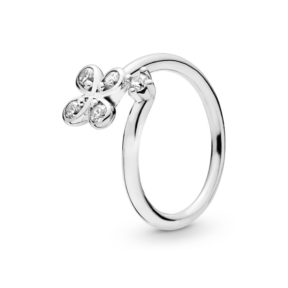 Modna, lśniąca symetria czteropłatkowego kwiatu zyskuje asymetryczny twist dzięki zakrzywionej obrączce, na której końcu znajduje się szlachetny kamień. Ten srebrny pierścionek jest wprost zaskakujący – wygląda jak otwarty pierścionek, choć tak naprawdę nim nie jest.
