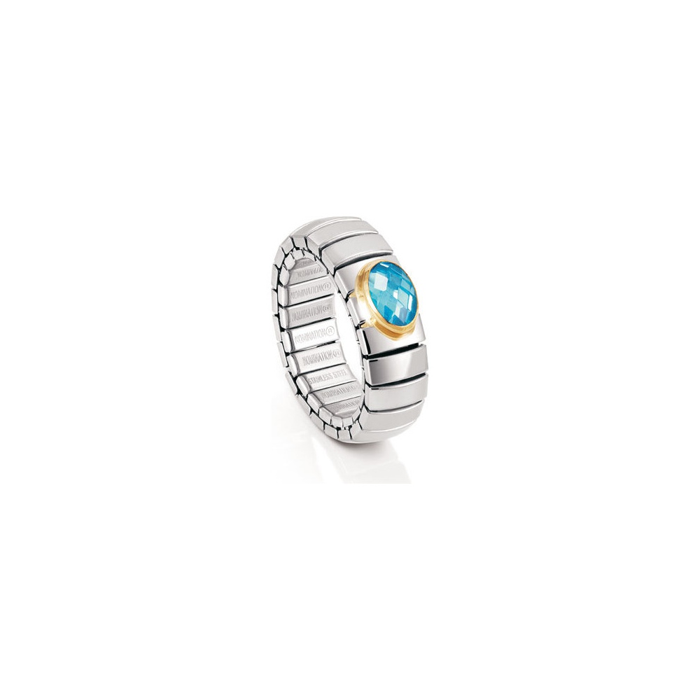 Szeroka obrączka Nomination wykonana ze stali szlachetnej z niebieską cyrkonią w oblamówce z 18k złota.