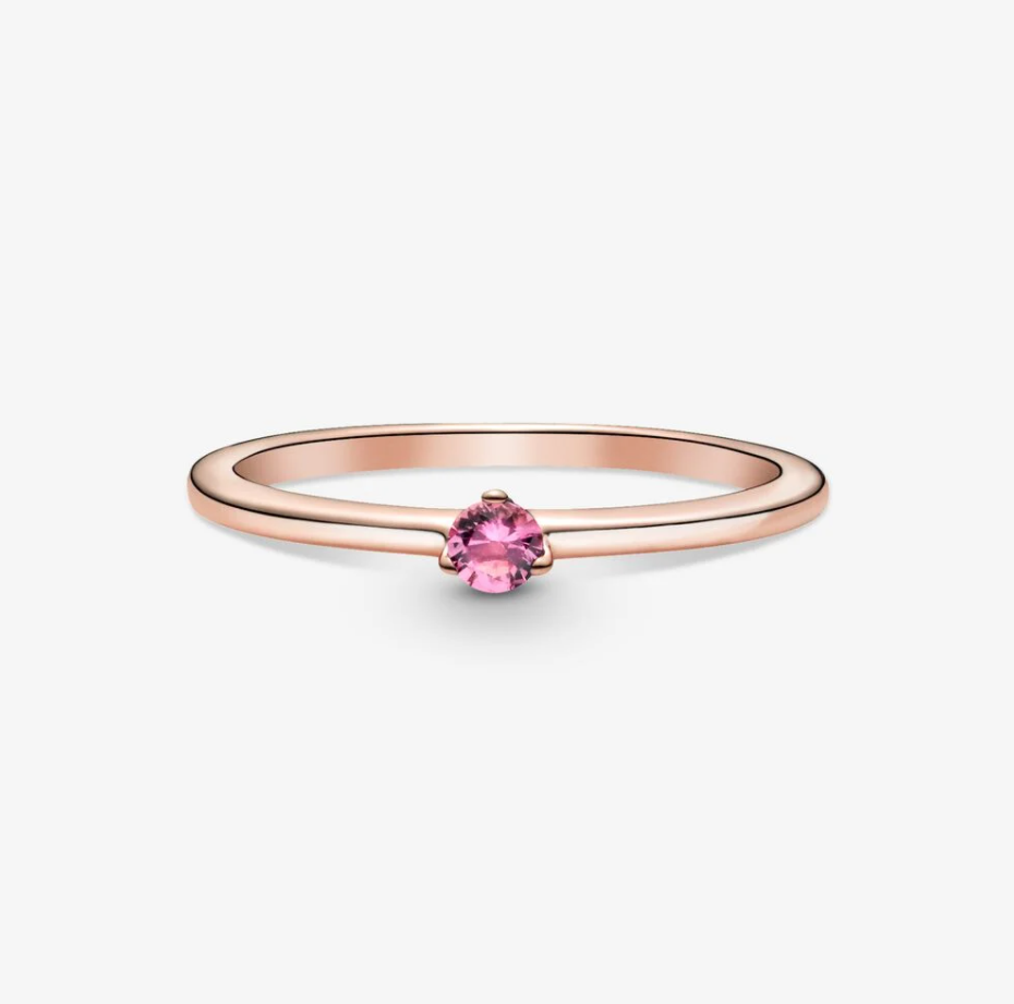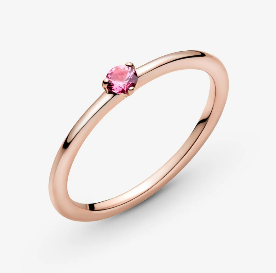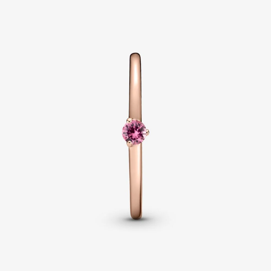 Różowy pierścionek solitaire będzie barwnym akcentem w Twojej kolekcji. Ten prosty pierścionek został wykończony ręcznie z Pandora Rose (unikalnego stopu metali platerowanego 14-karatowym różowym złotem) i ozdobiony jedną różową cyrkonią sześcienną. Połącz go w spójną kompozycję z pierścionkami wykonanymi z tego samego metalu lub dodaj coś srebrnego i zagraj kontrastem ciepłych oraz chłodnych odcieni.