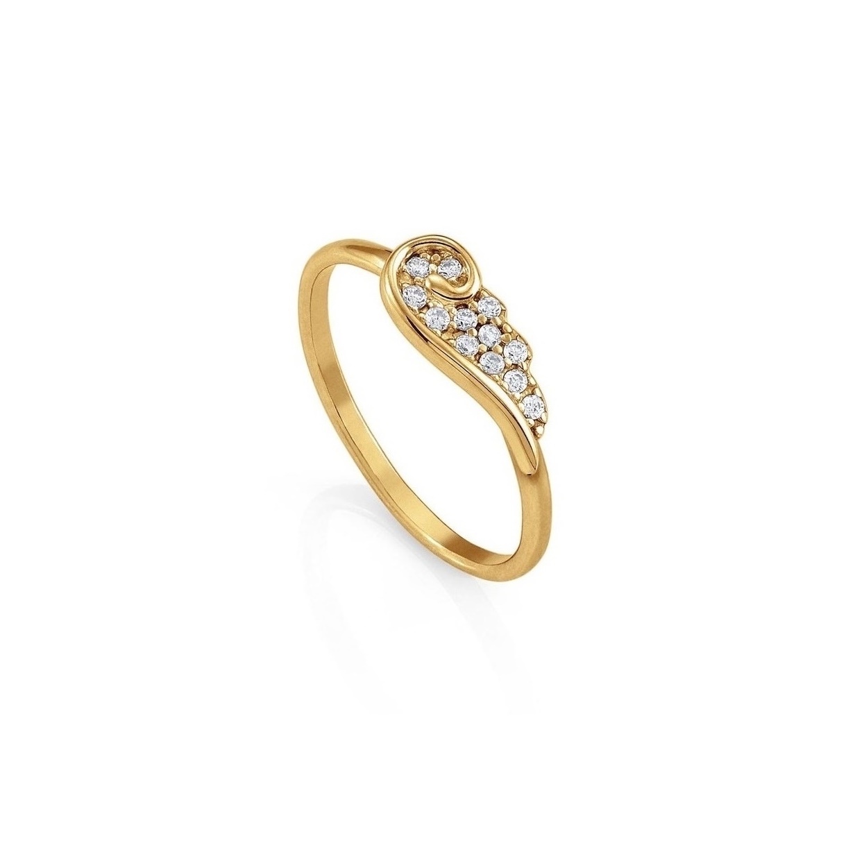Pierścionek ze srebra próby 925 pokrywanego 24-karatowym złotem z dodatkiem cyrkonii i oczkiem w kształcie skrzydła.