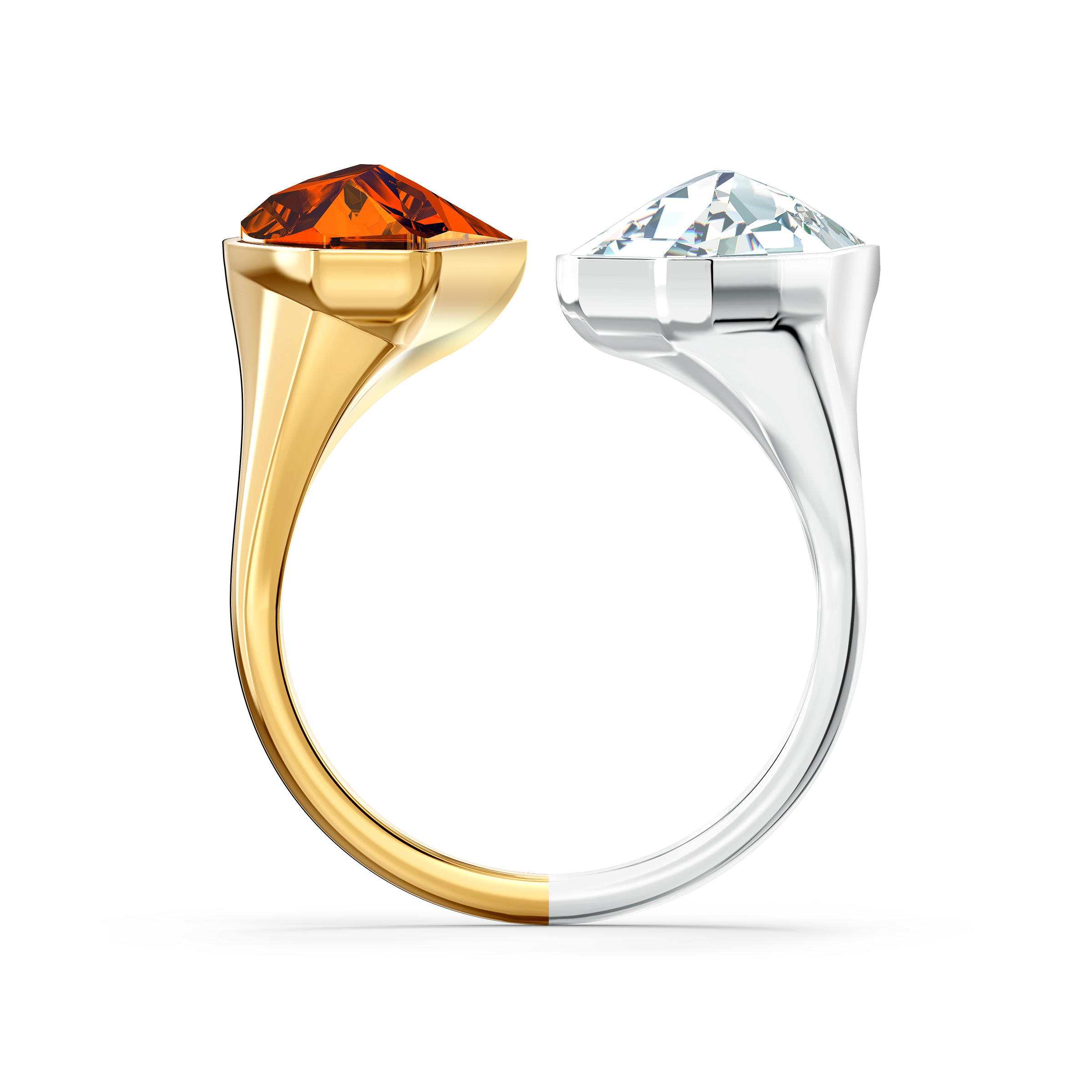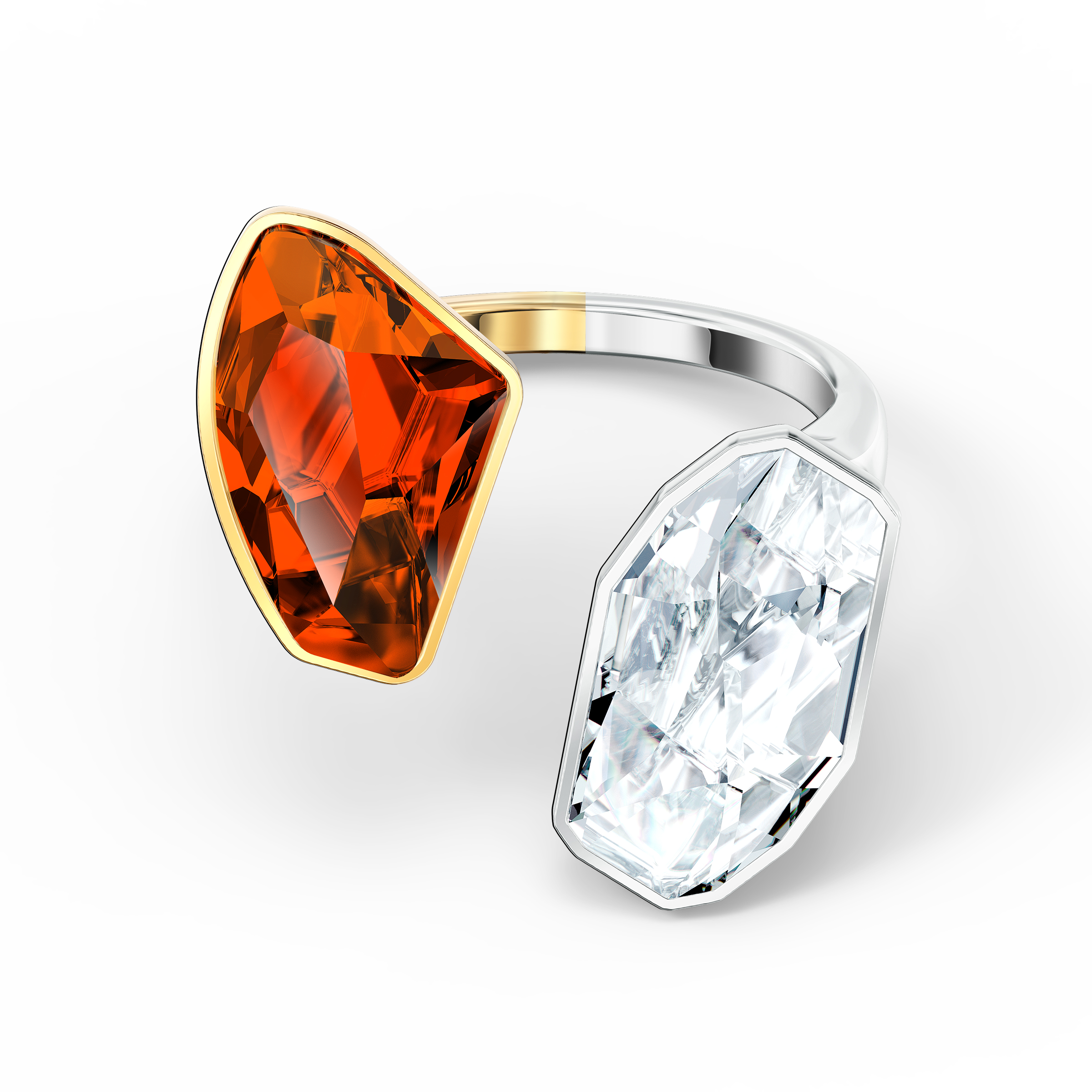 Jedyny w swoim rodzaju pierścionek Swarovskiego inspirowany żywiołami powietrza i ognia. Ozdobiony po obu stronach dwoma wyrazistymi kryształami o błyszczących fasetach — czerwonym i bezbarwnym — między którymi zachowano wolną przestrzeń. Subtelny i wyjątkowo piękny dodatek do codziennych stylizacji.