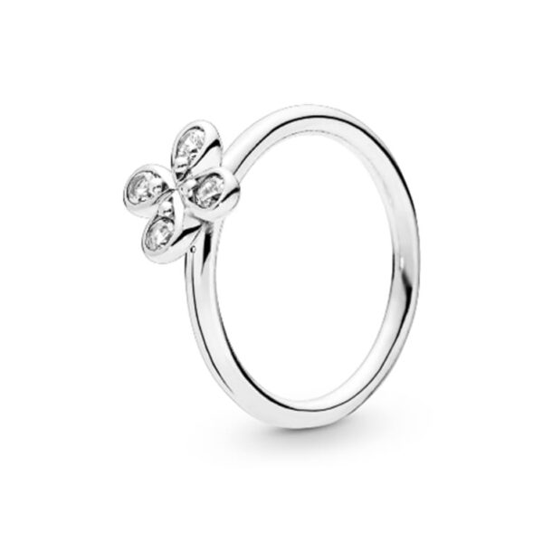Pierścionek z kwiatem o czterech płatkach z cyrkoniami sześciennymi marki Pandora. Pięknie ozdobiony lśniącymi kamieniami. Pierścionek jest delikatny, precyzyjnie wykonany, posiada niesamowity połysk, jak także niesamowity urok. Ten srebrny błyszczący kwiat o czterech płatkach jest ucieleśnieniem nowoczesnej elegancji dzięki swojej symetrii i świeżemu designowi. Płatki kwiatu, będące swoim lustrzanym odbiciem, olśniewają przeźroczystymi cyrkoniami sześciennymi, które połyskują niczym poranna rosa.