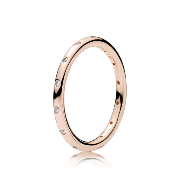 Dodaj sobie subtelnego blasku z pomocą pierścionka z unikalnego stopu metali Pandora Rose platerowanego 14-karatowym różowym złotem, który został ręcznie wykończony i wypolerowany na wysoki połysk. Klasyczny pierścionek symbolizujący wieczność ozdobiono połyskującymi cyrkoniami sześciennymi. Prosty a zarazem stylowy, wygląda elegancko noszony solo lub w połączeniu z innymi pierścionkami Pandora, wykonanymi z metali w kontrastujących kolorach.