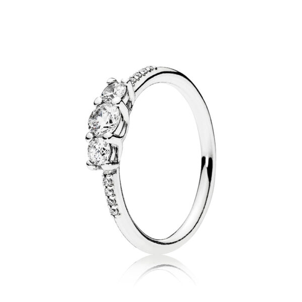 Podkreśl Twój unikalny styl tym ponadczasowym, eleganckim pierścionkiem. Finezyjnie wykonanym ze srebra próby 925. Klasyczny wzór z trzema cyrkoniami sześciennymi o szlifie brylantowym otoczonymi drobnymi, mieniącymi się kamieniami. Może olśniewać sam, albo w zestawieniu z innymi pierścionkami Pandora w bardziej nowoczesnym stylu.