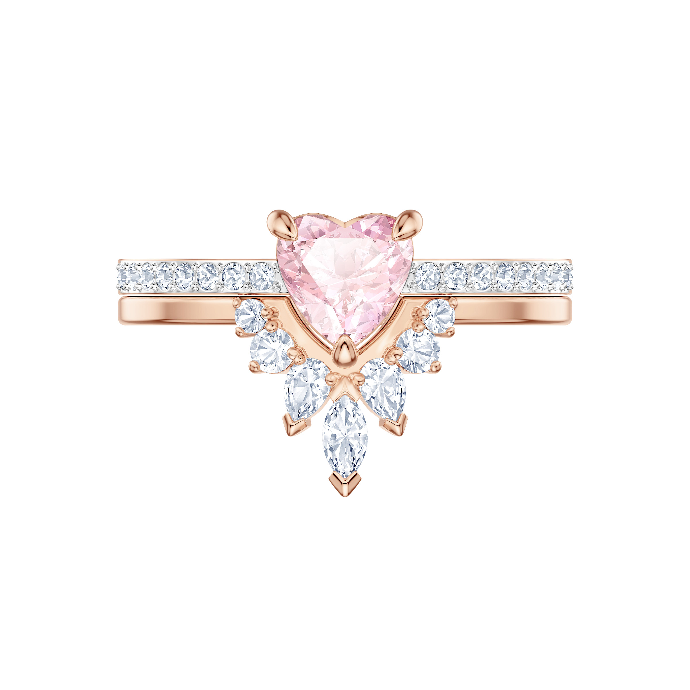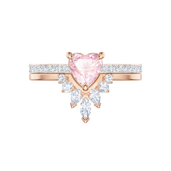 Urocz zestawu dwóch pierścionków powlekanych różowym złotem. Pierwszy z nich błyszczy pastelowo-różowym kryształem w kształcie serca i obręczą ozdobioną kryształami w oprawie pavé, a drugi ma nowoczesny kształt litery V, zaakcentowany bezbarwnymi kryształami. Pierścionki można nosić osobno lub razem, w zależności od nastroju. Łatwo komponują się z wieloma stylizacjami, dzięki czemu szybko staną się ulubionymi elementami każdej kolekcji biżuterii.