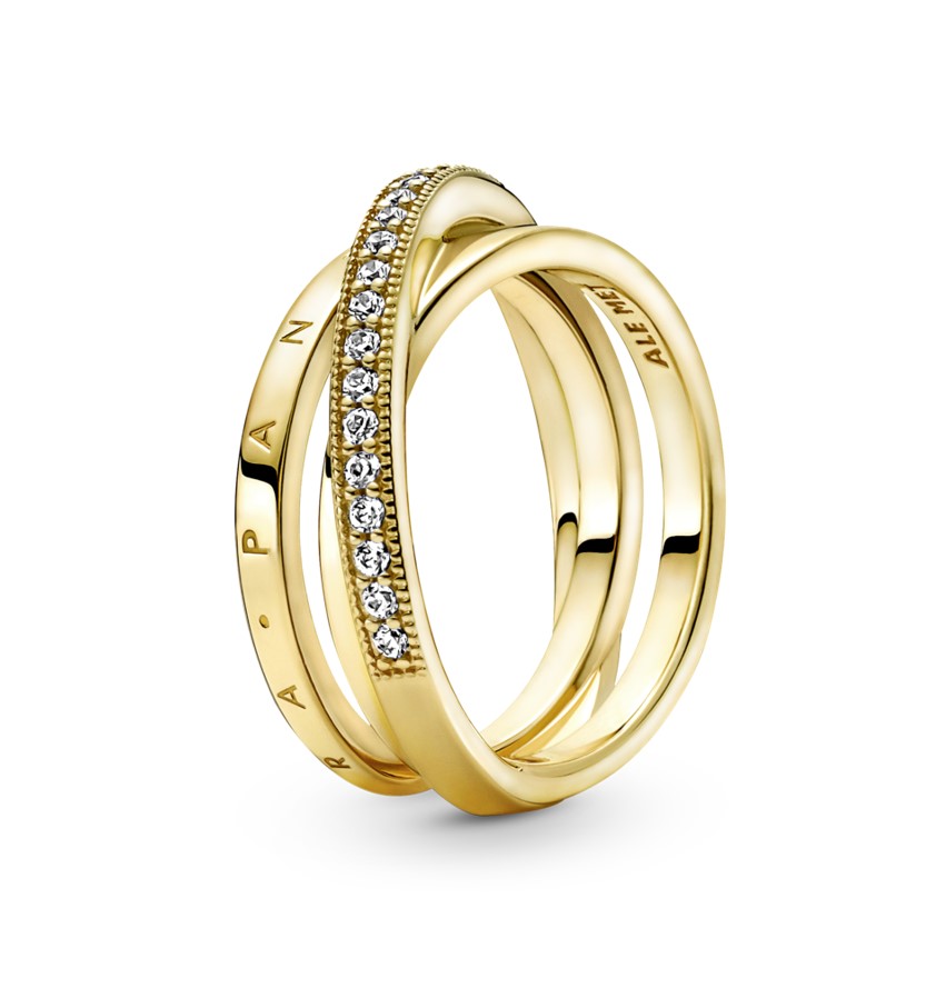 Zachwyć się potrójnym splotem pasm na pierścionku pavé. Jest platerowany 14-karatowym różowym złotem i składa się z trzech subtelnych pasm, z których jedno oplata pozostałe dwa. Jedno pasmo na spodzie zostało ozdobione logo Pandora, drugie lśni chłodnym blaskiem polerowanego metalu, a pasmo wierzchnie jest wysadzane przezroczystymi cyrkoniami sześciennymi pavé w obramowaniu mikrogranulacji. Smukły, strukturalny pierścionek zainspirowany fascynującym kształtem układu słonecznego doda subtelnego uroku każdej stylizacji.