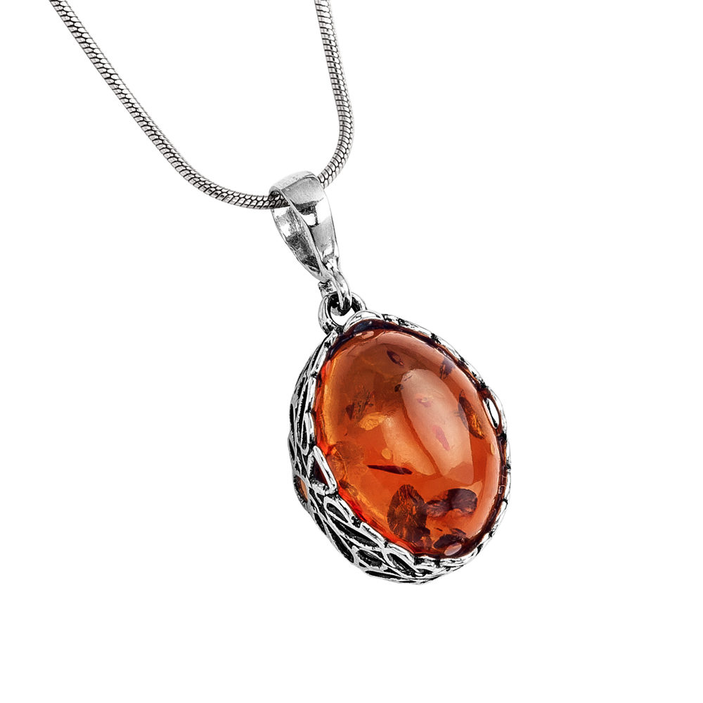 Owalny wisiorek z naturalnym bursztynem w kolorze koniakowym finezyjnie oprawiony oprawiony w srebro. W oprawie – motyw kwiatowy.