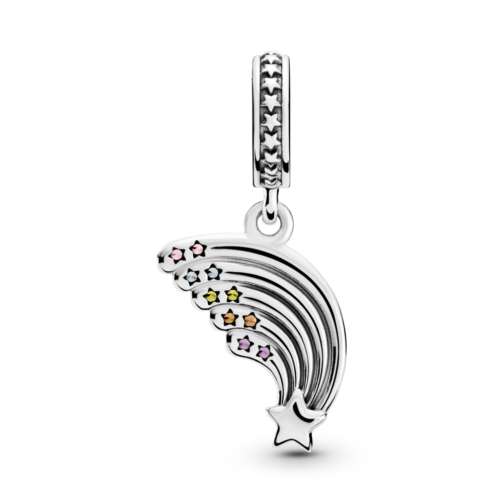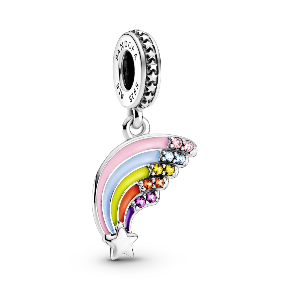Zawieszka z kolorową tęczą doda kolorów Twoim codziennym stylizacjom. Zwężające się pasma różowej, błękitnej, żółtej, pomarańczowej i lawendowej emalii są zakończone spadającą gwiazdą. Ogon tej komety skrzy się kryształami w pięciu różnych kolorach dopasowanych barwą do łuków tęczy. Uchwyt został ozdobiony wypukłymi gwiazdkami, zarysem chmurki i grawerunkiem „Together is better” („Razem najlepiej”). To efektowna, optymistyczna i niebanalna ozdoba każdej kompozycji.