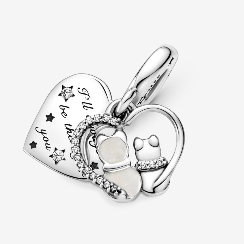 Pokaż, że kochasz koty, wybierając zawieszkę Koty i serca. Charms, ręcznie wykończony, ze srebra próby 925, ma z przodu ażurową zawieszkę z dwoma kotami, których ogony tworzą serce, częściowo ozdobione przezroczystą cyrkonią. Jeden z kotów udekorowany jest ręcznie nakładaną, lśniącą, srebrną emalią, natomiast na obroży drugiego znajduje się przezroczysta cyrkonia. Na tylnej zawieszce, w ramce w kształcie gwiazdki, połyskuje cyrkonia oraz grawerowany tekst „I’ll always be there for you” (Zawsze będę dla Ciebie).