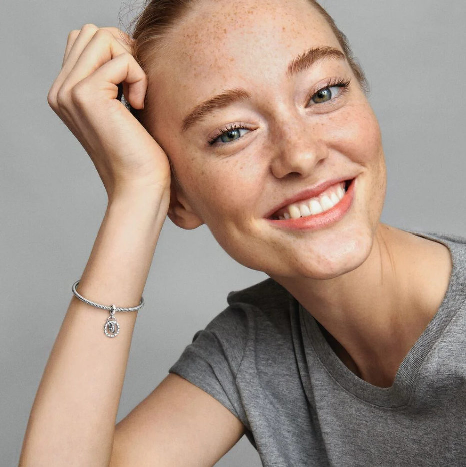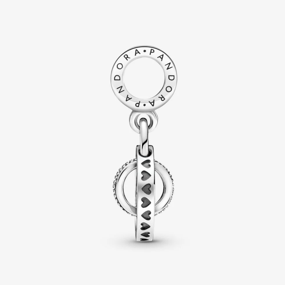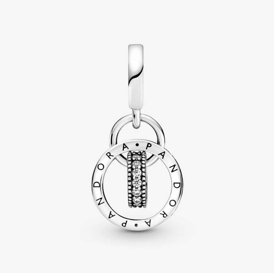 Będziesz chciała go nosić na okrągło. Ten srebrny charms z logo Pandora łączy trzy kręgi różnej wielkości. Środkowy krąg z polerowanego metalu splata się z większym, ruchomym kręgiem – ozdobionym dwoma logotypami Pandora i sercami cut-out. Zawieszony w środku prostopadle mniejszy krąg jest wysadzany pasmem przezroczystych cyrkonii sześciennych pavé w obramowaniu mikrogranulacji. Wszystkie trzy kołyszą się w takt ruchów, przyciągając wzrok i dodając stylizacji dynamiki.
