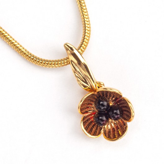 Wisiorek z wiśniowym bursztynem w kształcie kwiatka oprawionego w srebro w kolorze żółtego złota.