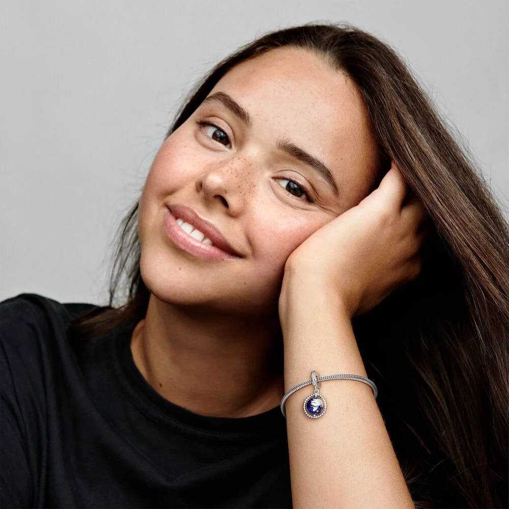 Dzięki tej zawieszce z globusem wyraź swoją miłość do podróży i kształtuj swój niepowtarzalny styl. Ręcznie wykonana ozdoba w kształcie Ziemii obraca się w środku obręczy z efektem granulacji. Zawieszka globus została ozdobiona ręcznie nakładaną, połyskującą emalią imitującą wodę. Dodaj ją do swojej ulubionej bransoletki Pandora Moments wraz z innymi charmsami podróżnymi, aby wyrazić swoją ciekawość świata.