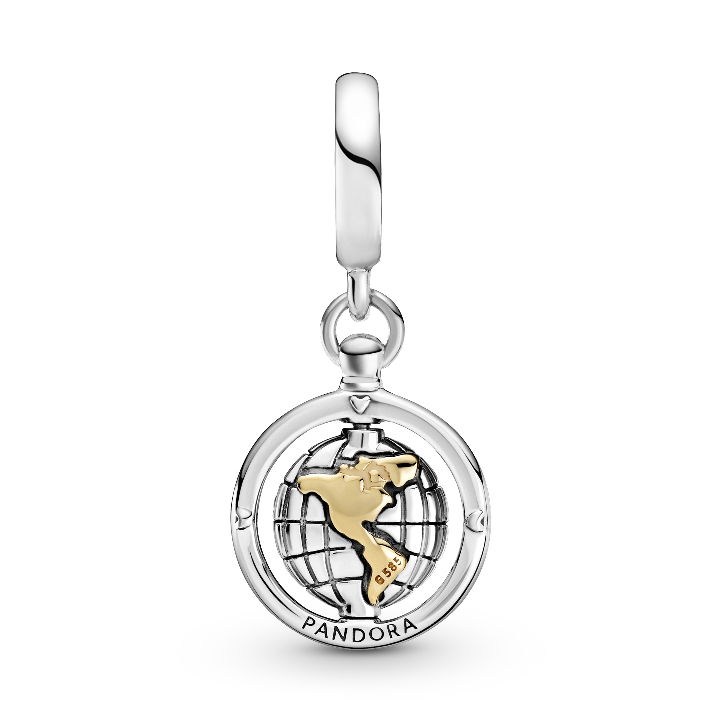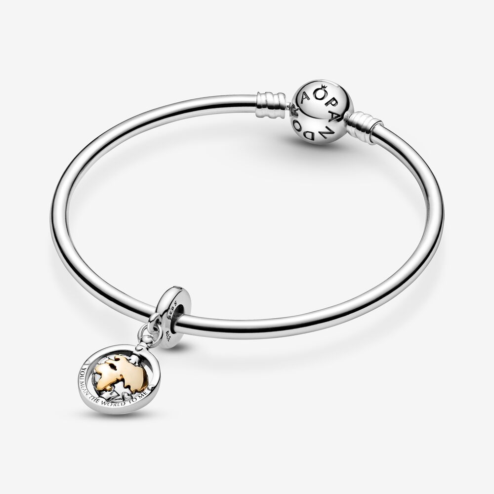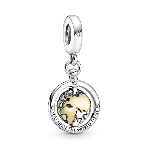 Ta wykonana ze srebra zawieszka Pandora z detalami z 14-karatowego złota przedstawia silne więzy miłości i mówi, że uczucia nie mają granic geograficznych.