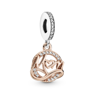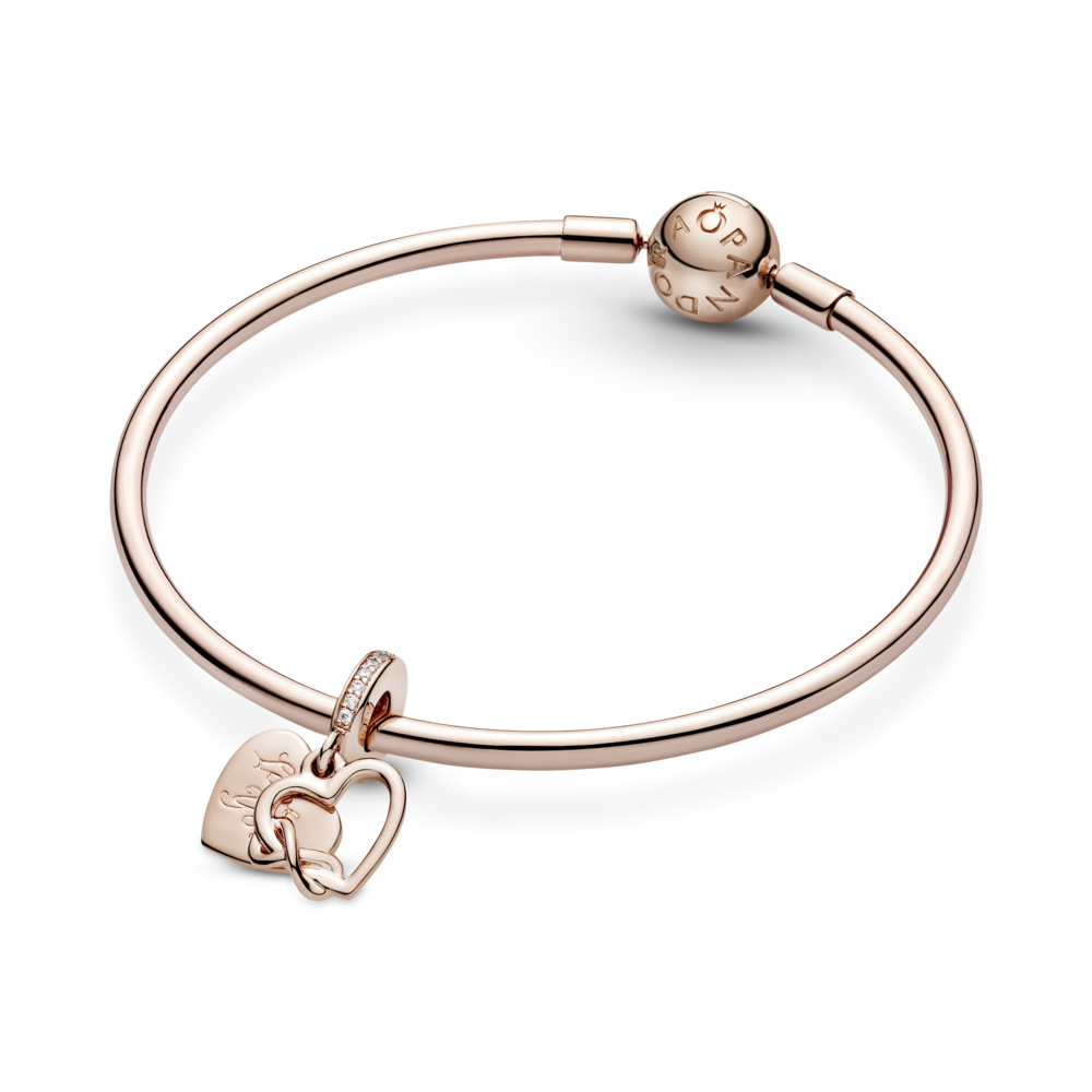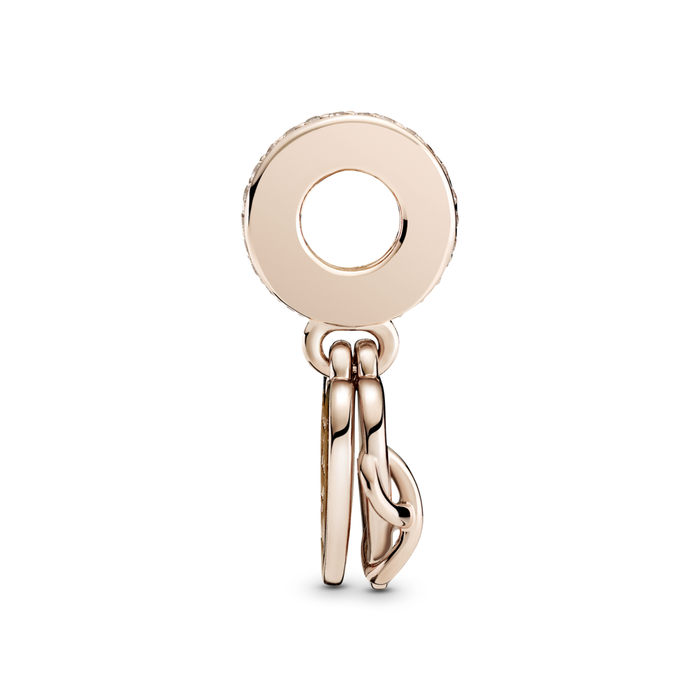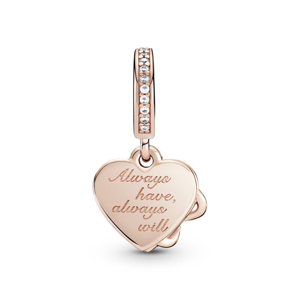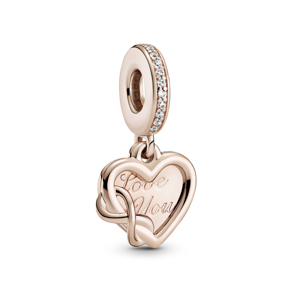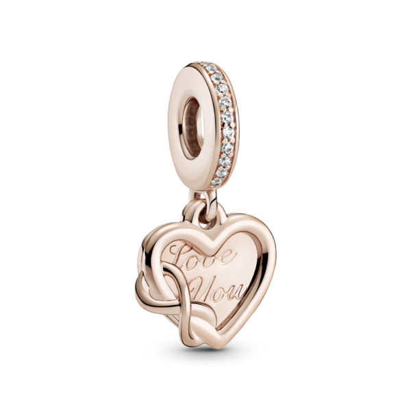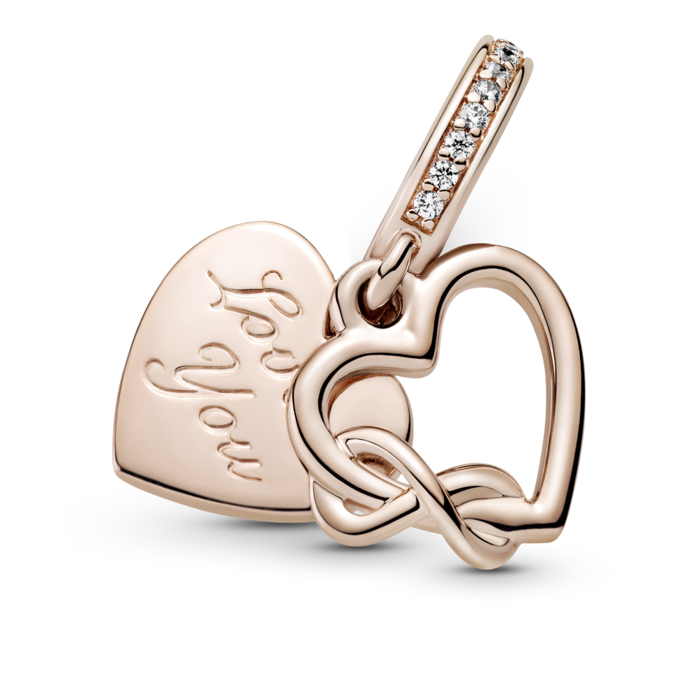 Zawieszka w kształcie serca ze srebra próby 925 i unikalnego stopu metali Pandora Rose, składająca się z podwójnych zawieszek z sercami i znakiem nieskończoności. Przód to zarys w kształcie serca z symbolem nieskończoności oplecionym wokół lewej krawędzi serca. Tył w kształcie serca z grawerem z przodu i z tyłu; rząd pavé dookoła uchwytu. Inspiracja: więzi rodzinne; wieczna miłość. Grawery: „Zawsze byłem, zawsze będę” i „Kocham Cię” nadają zawieszce miłosnego klimatu.