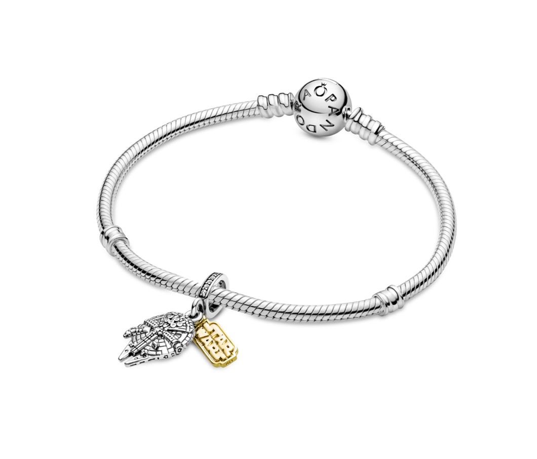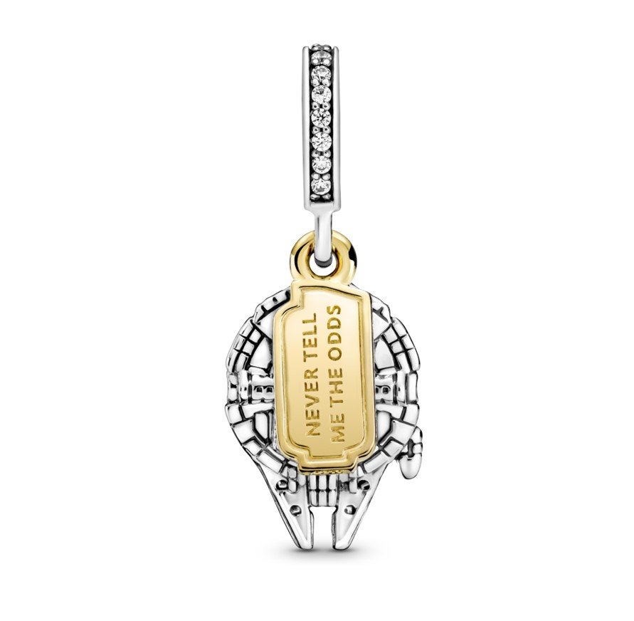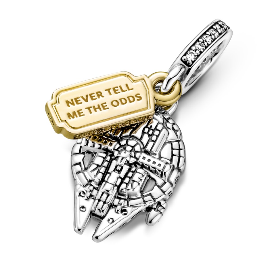 Moc będzie blisko Ciebie, jeśli wybierzesz zawieszkę Star Wars™ Sokół Millennium™. Ten ręcznie wykończony charms w dwóch odcieniach ze srebra próby 925 i metalu platerowanego 14-karatowym różowym złotem, świetnie oddaje galaktyczne klimaty. Jedna zawieszka to statek kosmiczny Sokół Millennium z misternymi szczegółami technicznymi, natomiast druga to przywieszka z logo Star Wars po jednej stronie i grawerem „Never tell me the odds” (Nigdy nie mów mi o szansach) po drugiej.