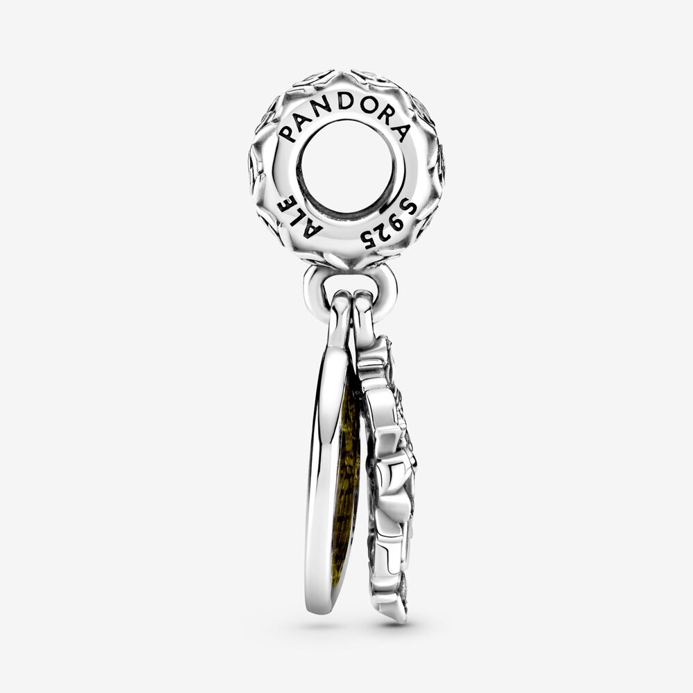 Przenieś sie do magicznego świata Pięknej i Bestii z tą podwójną zawieszką. Bella i Bestia tańczą w ażurowej ramce, którą oplatają róże wysadzane żółtymi kryształami syntetycznymi. Drugi dysk przedstawia salę balową prześwitującą spod przezroczystej żółtej emalii. Uchwyt został dodatkowo ozdobiony różyczkami 3D. Zawieszka upamiętniająca nieidealną, ale magiczną miłość Pięknej i Bestii została też ozdobiona grawerunkiem „Beauty is found Within”.