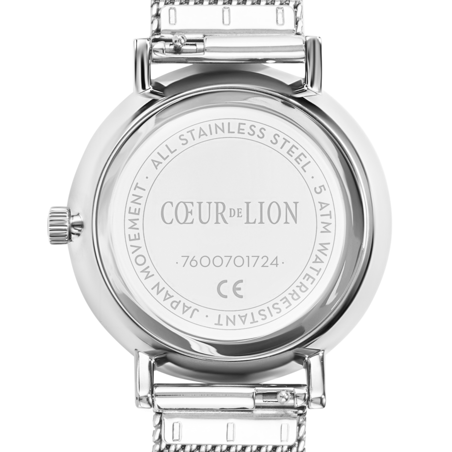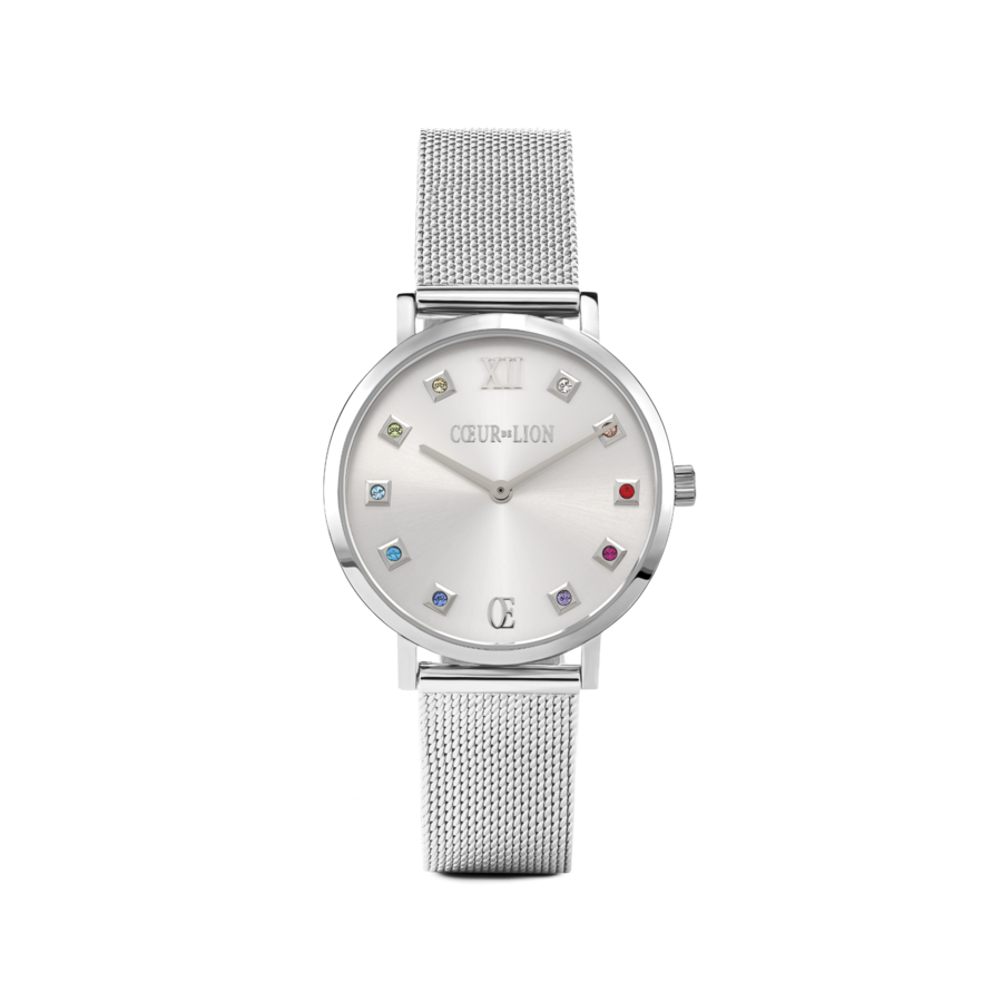 Wysokiej jakości koperta i bransoleta Milanese ze stali nierdzewnej są połączone ze srebrną tarczą Sunray z błyszczącymi kryształami Swarovski®, aby uzyskać wybuch koloru.