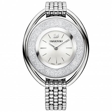 Czarujący zegarek Swarovski z linii Crystalline dzięki błyszczącym kryształkom olśni rękę każdej kobiety. Posiada kwarcowy, szwajcarski mechanizm – Swiss Made. Owalna, w odcieniu srebra koperta zegarka została wykonana ze stali nierdzewnej. Wnętrze koperty wypełnia około 1700 kryształów Swarovski w odcieniu szarym. Średnica koperty (kształt owalny) wynosi 37 x 43 mm. Bransoleta zegarka wykonana jest ze stali szlachetnej. Odporny na działanie wody – do 30 metrów.