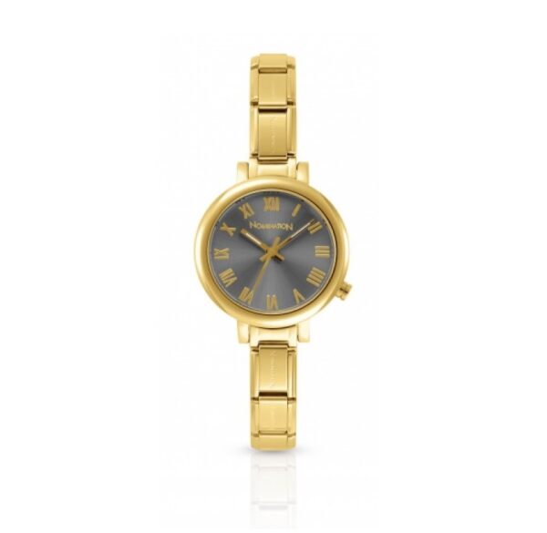 Zegarek ze stali szlachetnej pokryty powłoką PVD w kolorze złotym i z klasyczną bransoletką Composable, którą można dowolnie personalizować modułami. Pasują do niego wszystkie zawieszki Composable z kolekcji Classic. Tarcza w stonowyanym, ciemnoszarym kolorze. Wyposażony w szkło mineralne ( 5 stopień w skali Mohsa) – najczęściej spotykane, bardzo przejrzyste, czyste, cienkie, elastyczne i odporne na pęknięcia. Klasyczny kształt tarczy pozwoli dopasowywać zegarek do niemal każdej stylizacji. Dodatkowym atutem jest umieszczone logo NOMINATION w górnej części tarczy. Wykorzystanie wysokiej jakości stali w bransolecie gwarantuje, że zegarek odporny jest na korozję i uszkodzenia oraz nie powoduje alergii. W zegarkach Nomination wykorzystany jest jeden z najlepszych stopów stali 316L. Zegarek posiada bransoletę z wymiennymi elementami.