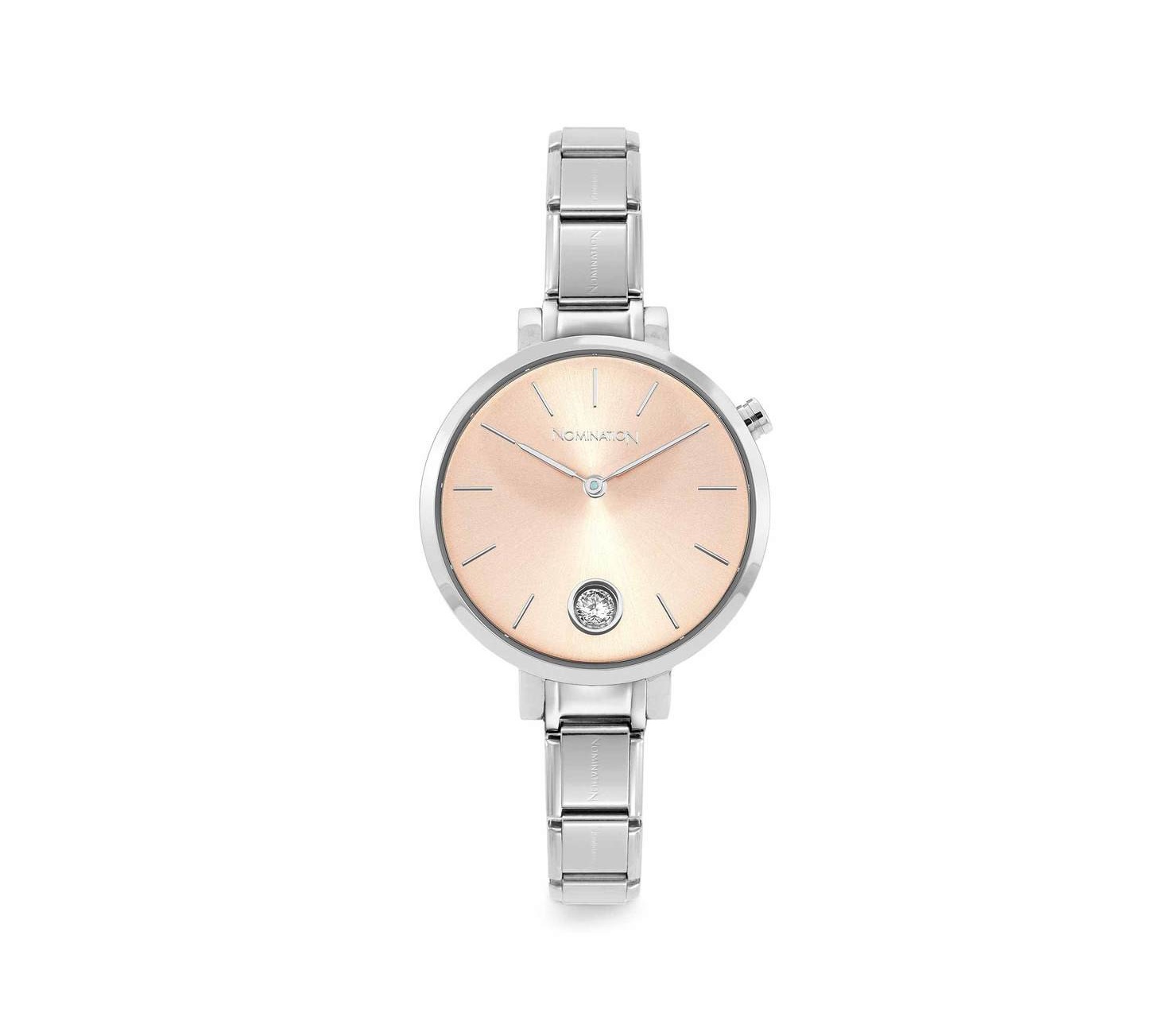 Zegarek ze stali nierdzewnej z cyrkonią i z klasyczną bransoletką Composable, którą można dowolnie personalizować modułami. Pasują do niego wszystkie zawieszki Composable z kolekcji Classic. Tarcza w kolorze różowym. Wyposażony w szkło mineralne ( 5 stopień w skali Mohsa) – najczęściej spotykane, bardzo przejrzyste, czyste, cienkie, elastyczne i odporne na pęknięcia. Klasyczny kształt tarczy pozwoli dopasowywać zegarek do niemal każdej stylizacji. Dodatkowym atutem jest umieszczone logo NOMINATION w górnej części tarczy. Wykorzystanie wysokiej jakości stali w bransolecie gwarantuje, że zegarek odporny jest na korozję i uszkodzenia oraz nie powoduje alergii. W zegarkach Nomination wykorzystany jest jeden z najlepszych stopów stali 316L. Zegarek posiada bransoletę z wymiennymi elementami.