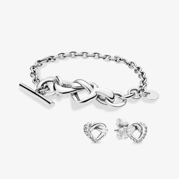 Supełek na tej bransoletce miłości symbolizuje długowieczną miłość, bliskie relacje i nierozerwalne więzi. Ręcznie wykończona bransoletka ze srebra z zapięciem T-bar składa się z dużych ogniw oraz utworzonego z węzłów serca na środku, dzięki czemu uzyskano jej masywny wygląd. Przesuwane zapięcie bransoletki ozdobione sercem przechodzi przez największe ogniwo, umożliwiając swobodne otwieranie i zamykanie. Noś ją, aby wyrazić swój styl lub połącz ją z innymi, ulubionymi bransoletkami.
